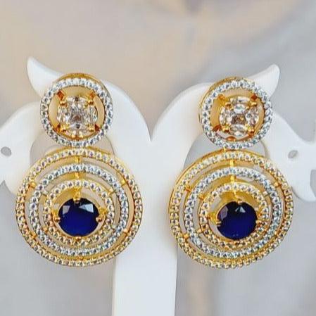 The Blue Amvi Drop is small yet elegant, featuring concentric circles of American Diamond and a center red stone. The perfect combination of beauty and sophistication. Add a touch of luxury to any outfit with this stunning piece.