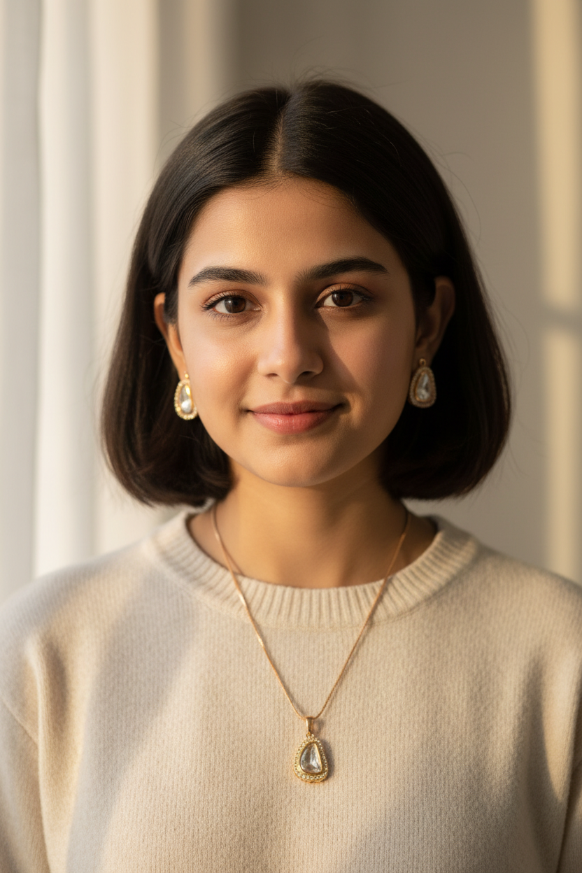 The Gold Dea Kundan Pendant Set beautifully combines traditional kundan stones with shimmering American diamonds for a minimalistic yet elegant look. Designed to enhance your natural grace, this set includes matching earrings that perfectly complement the pendant, making it an ideal choice for those who value subtle sophistication and timeless style.
