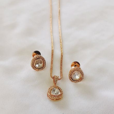 This Gold Hiranya Kundan Pendant Set features a delicate design enhanced by a lining of sparkling American diamonds. Its elegant craftsmanship makes it a beautiful choice for adding a subtle yet stunning touch to your look. Perfect for special occasions or everyday wear, this set offers timeless charm with a graceful appeal.