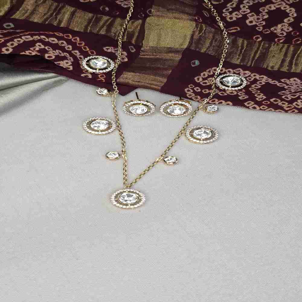 Handcrafted kundan pendant set featuring delicate round charms adorned with American diamonds on brass base. Includes matching earrings for a coordinated look. The intricate detailing and versatile design make this piece suitable for both everyday wear and special occasions.