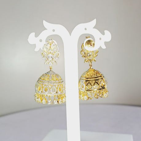 The Gold Mysha Jhumki earrings showcase a beautifully unique design adorned with sparkling American Diamonds. These earrings offer a perfect blend of elegance and tradition, making them a wonderful choice to enhance your look for any occasion. Comfortable to wear, they support your style with a touch of timeless charm.