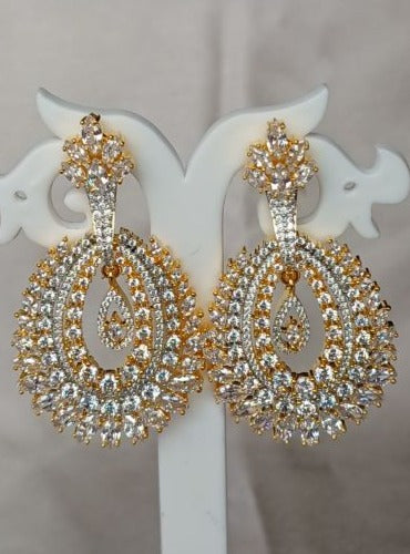 Adorn yourself with our Gold American Diamond Dangle Earrings, a stunning fusion of glamour and grace. The elegant oval shape creates a captivating play of light. These earrings are a radiant expression of sophistication, perfect for those who appreciate timeless beauty with a touch of luxury. Elevate your style effortlessly with these exquisite dangle earrings.