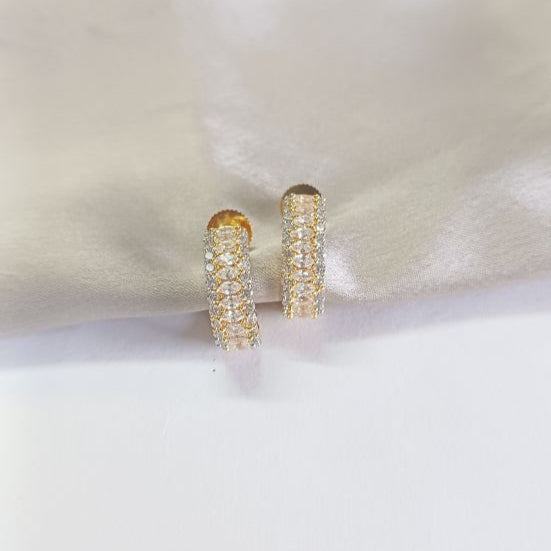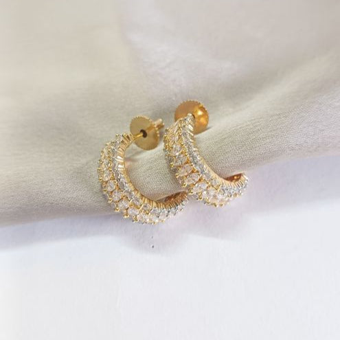 The Gold Ushma Diamond Balis showcase a sophisticated C-shaped design adorned with three precise lines of lustrous American diamonds. These earrings combine expert craftsmanship with timeless elegance, delivering exceptional sparkle and style. Perfectly balanced for both formal and everyday wear, they add a touch of refined beauty to any ensemble.
