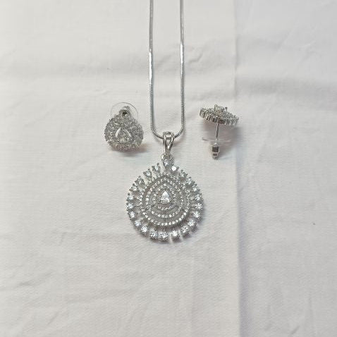 Elevate your everyday elegance with this exquisite silver-finished brass pendant set. The delicate dew drop pendant, adorned with premium American diamonds, pairs seamlessly with matching stud earrings for a coordinated look. Crafted to rival authentic diamond brilliance, this versatile set transitions effortlessly from day to evening wear.