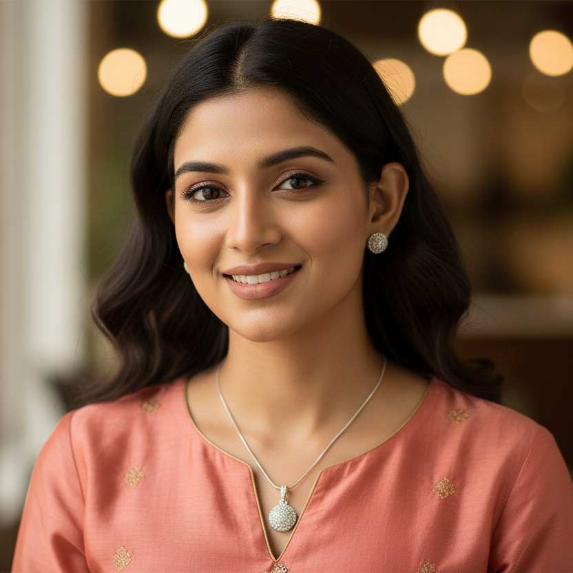 Elevate your everyday elegance with the Silver Dyuti Diamond Pendant Set. Crafted from brass with luxurious silver plating, this stunning collection features a round diamond-studded pendant paired with matching earrings that capture the brilliance of fine jewelry. The realistic sparkle rivals genuine diamonds while remaining lightweight and comfortable for all-day wear. Perfect for layering, special occasions, or adding sophistication to casual outfits, this versatile set delivers timeless glamour without the premium price tag.