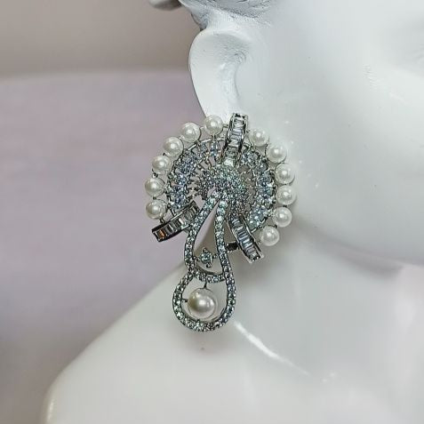 Elevate your everyday look with our Silver Miraya Studs. These American Diamond Stud earrings feature a stunning peacock shape, accented with a delicate pearl outline. Add a touch of sophistication and grace with these versatile and elegant studs. Perfect for any occasion!