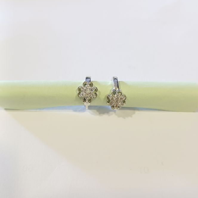 The Silver Talika Diamond Hoops feature petite hoops delicately accented with a small flower motif, crafted to highlight the brilliance of American diamonds. Their refined design offers a subtle yet sophisticated sparkle, perfect for enhancing any outfit with a touch of elegance and charm. Ideal for those who appreciate expert craftsmanship in a beautifully understated style.